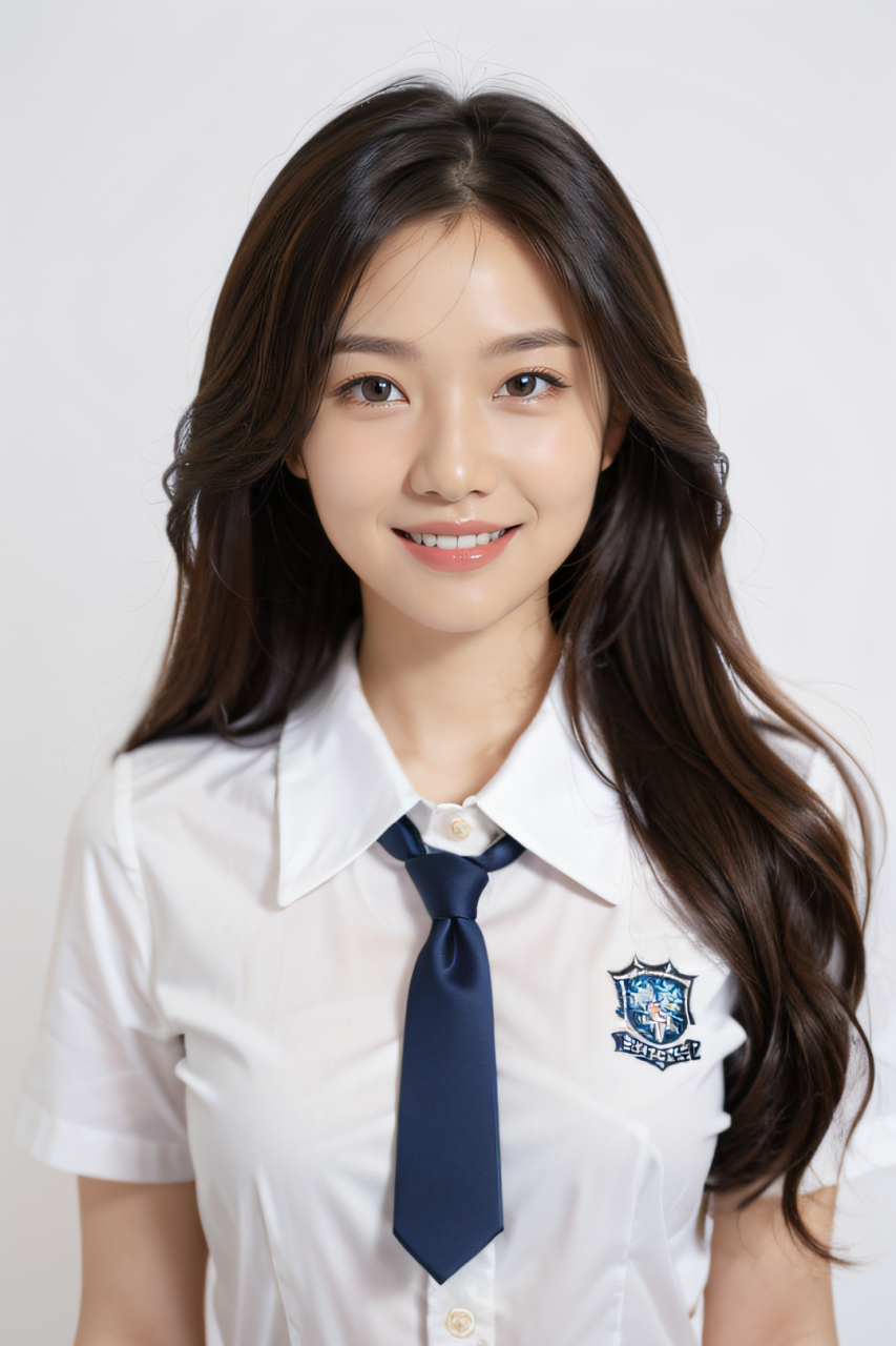 提示词:1个女孩上半身肖像,长发,穿着校服,带着骄傲自信的微笑表情,看着观众,工作室时尚肖像,工作室光线,纯白色背景
