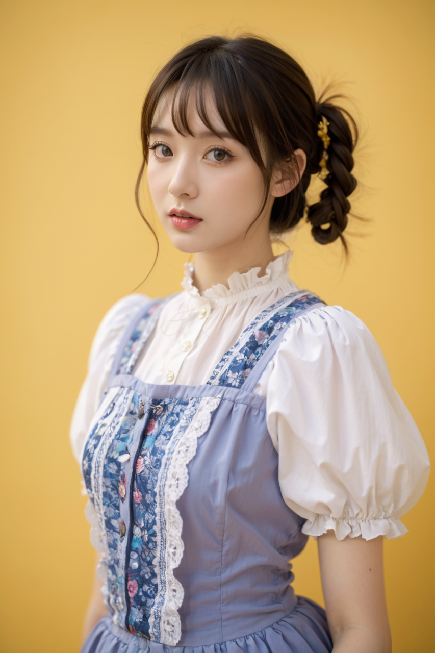 **提示词:**上半身,动态角度,酷的姿势,1girl,solo,onono_imoko,黄色背景,牛仔拍摄,彩色背景,洛丽塔时尚,质量最好,质量惊人,非常美学,荒诞,印象派风格